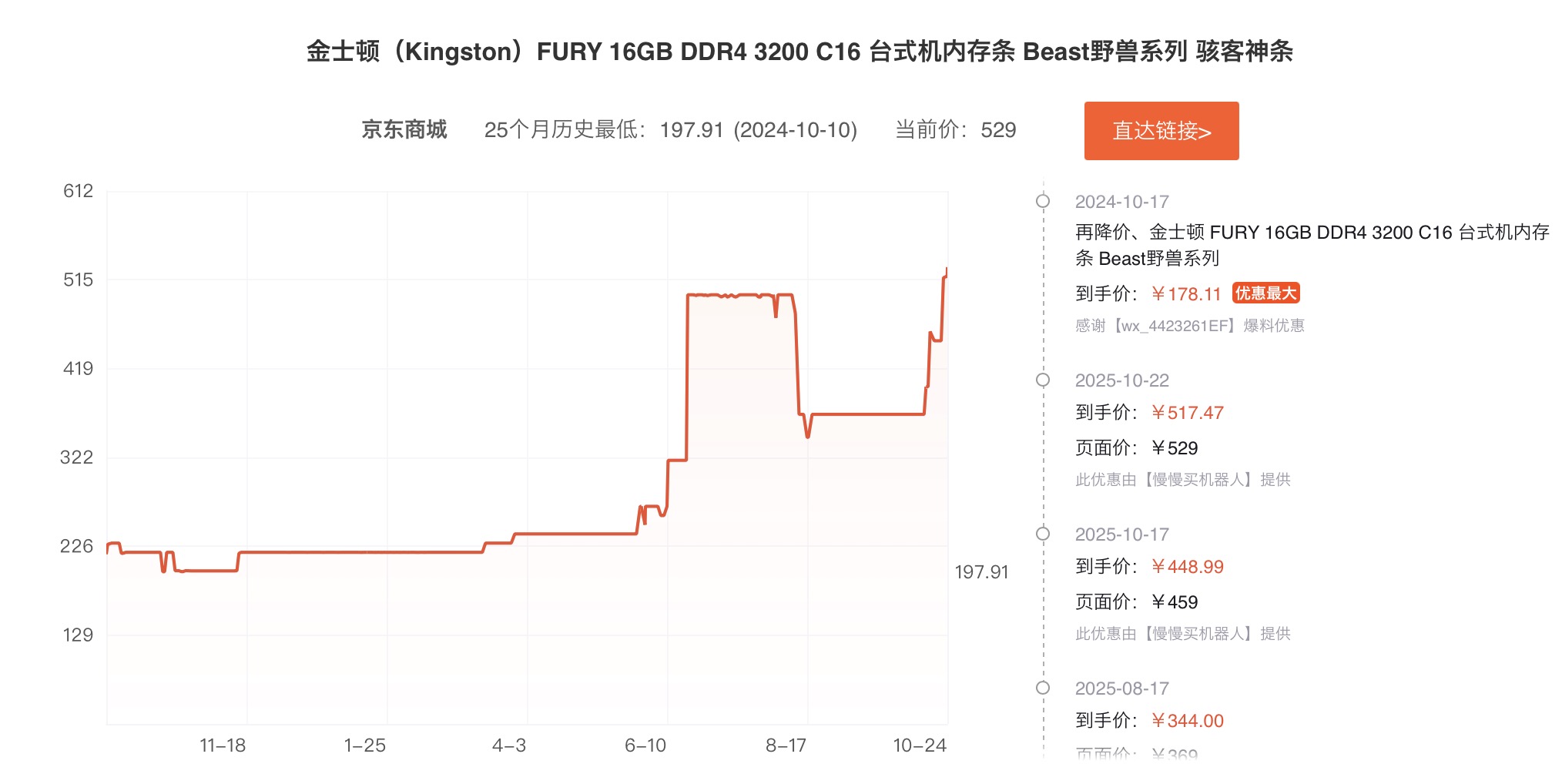 多位模组厂人士向记者表示,从今年一季度开始,DDR4 的原厂价格持续走高。根据慢慢买 App,一款金士顿 (Kingston) 的 DDR4 台式机内存条,价格从今年 3 月开始急速上涨,目前售价已超去年同期两倍。