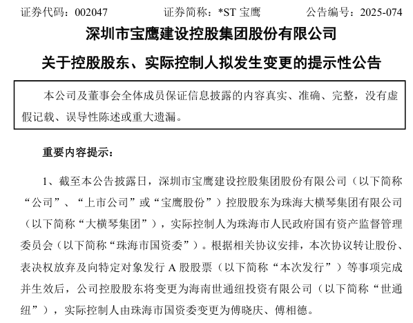 根据相关协议安排,本次协议转让股份、表决权放弃及向特定对象发行 A 股股票等事项完成并生效后,公司控股股东变更为世通纽,实际控制人变更为傅晓庆、傅相德。公司股票自 10 月 27 日开市起复牌。
