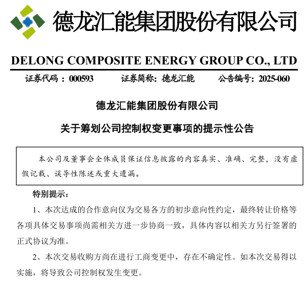 德龙汇能(000593)10 月 24 日公告,公司控股股东北京顶信瑞通科技发展有限公司与东阳诺信芯材企业管理合伙企业 (有限合伙)(下称 「诺信芯材」) 签订了 《股份转让之意向协议》,拟将其持有公司 29.64% 股份转让给诺信芯材,(交易) 可能导致公司控制权发生变更。目前,各方主体正在就具体交易方案、协议等相关事项进行磋商,尚存在重大不确定性。