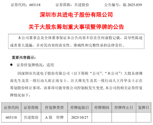 共进股份(603118)10 月 24 日公告,公司近日收到大股东唐佛南及其一致行动人崔正南、汪大维及其一致行动人王丹华通知,其正在筹划有关公司的股权转让事宜,该事项可能导致公司的控制权变更。