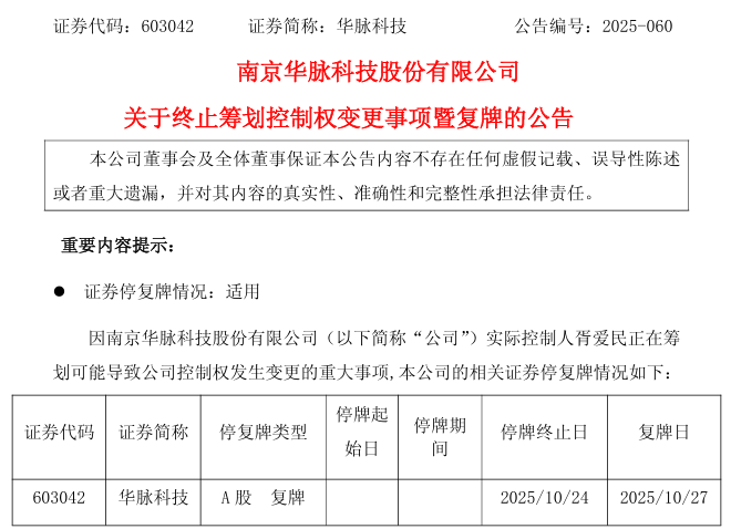 此外,10 月 20 日华脉科技(603042) 因筹划控制权变更事项停牌。10 月 24 日晚间该公司披露,停牌期间,公司就筹划控制权变更事项进行了充分探讨,但由于涉及事项较多,与交易对方就核心事项未达成共识,经慎重考虑,交易双方决定终止筹划本次重大事项。经公司向上海证券交易所申请,公司股票将于 2025 年 10 月 27 日 (星期一) 上午开市起复牌。