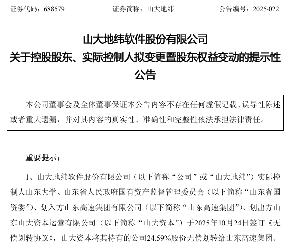 同日,山大地纬(688579) 公告,公司实际控制人山东大学、山东省人民政府国有资产监督管理委员会 (简称 「山东省国资委」)、划入方山东高速集团有限公司 (简称 「山东高速集团」)、划出方山东山大资本运营有限公司 (简称 「山大资本」) 于 2025 年 10 月 24 日签订 《无偿划转协议》,山大资本将其持有的公司 24.59% 股份无偿划转给山东高速集团。
