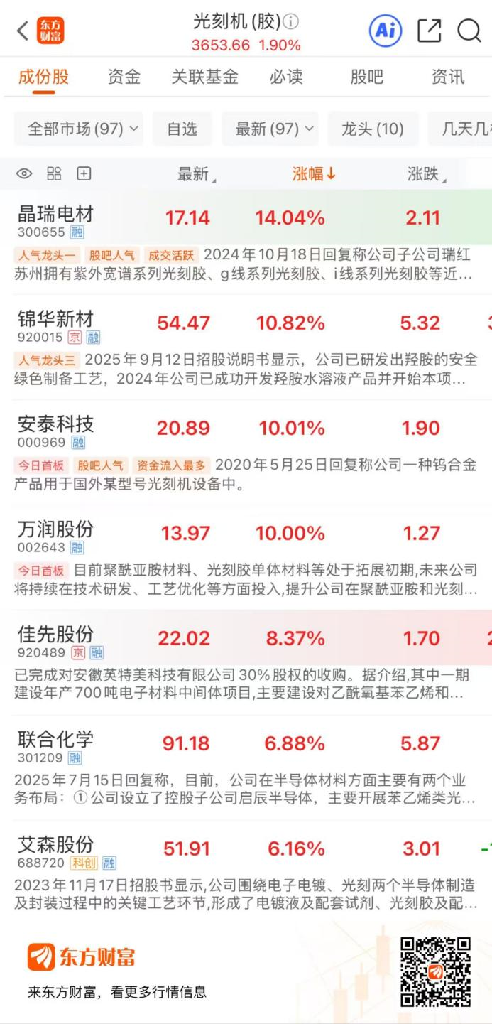 10 月 27 日早盘,A 股光刻胶板块大涨,截至发稿,晶瑞电材涨超 14%,锦华新材涨超 10%,安泰科技、万润股份涨停,佳先股份涨超 8%,联合化学、艾森股份涨超 6%,彤程新材、钢研纳克、南大光电、江化微等涨超 5%。