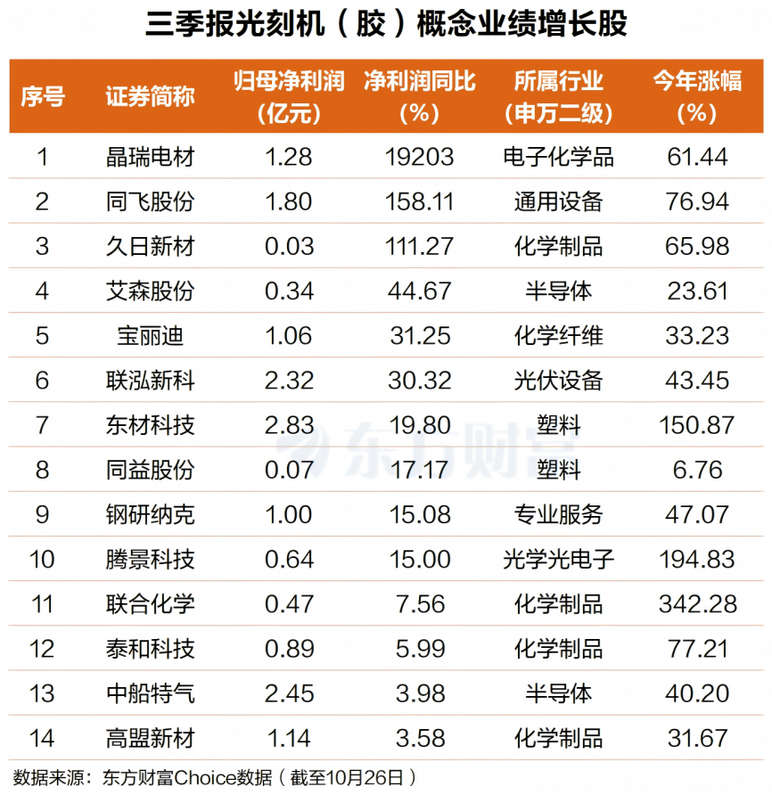 据东方财富Choice 数据,截至 10 月 26 日,A 股光刻机 (胶) 板块中已有二十余家公布了今年三季报,其中 14 家公司净利润同比增长。晶瑞电材净利润同比增幅最大,达 192 倍,同飞股份、久日新材净利润同比翻倍有余,艾森股份、宝丽迪等同比增超 30%。