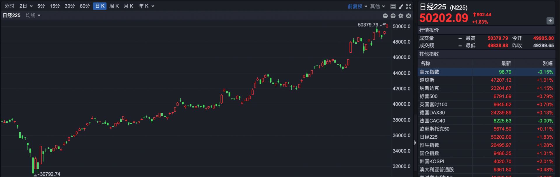 今日亚太股市全线走强,日经指数大涨 904 点,历史上首次突破 50000 点大关,盘中最高报 50379.79 点。截至发稿,日经指数报 50202 点,涨幅 1.83%。