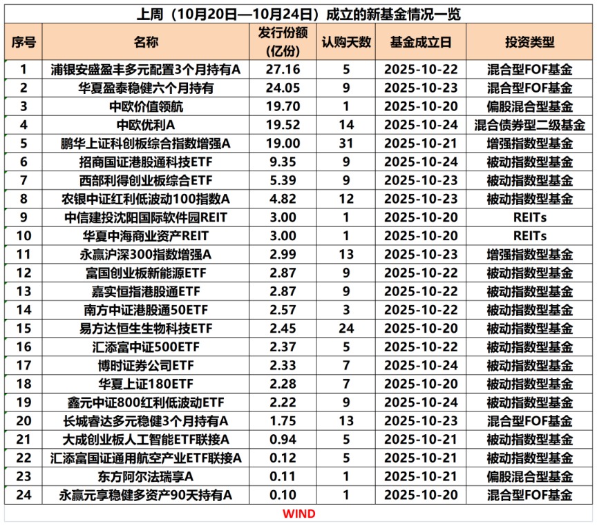 10 月 24 日,华夏基金发布华夏盈泰稳健六个月持有期混合型基金中基金 (FOF) 基金合同生效公告。根据公告,该基金募集期间净认购金额为 24.05 亿元。此外,于 10 月 22 日公告成立的浦银安盛盈丰多元配置 3 个月持有混合 FOF,募集规模也超 27 亿元。