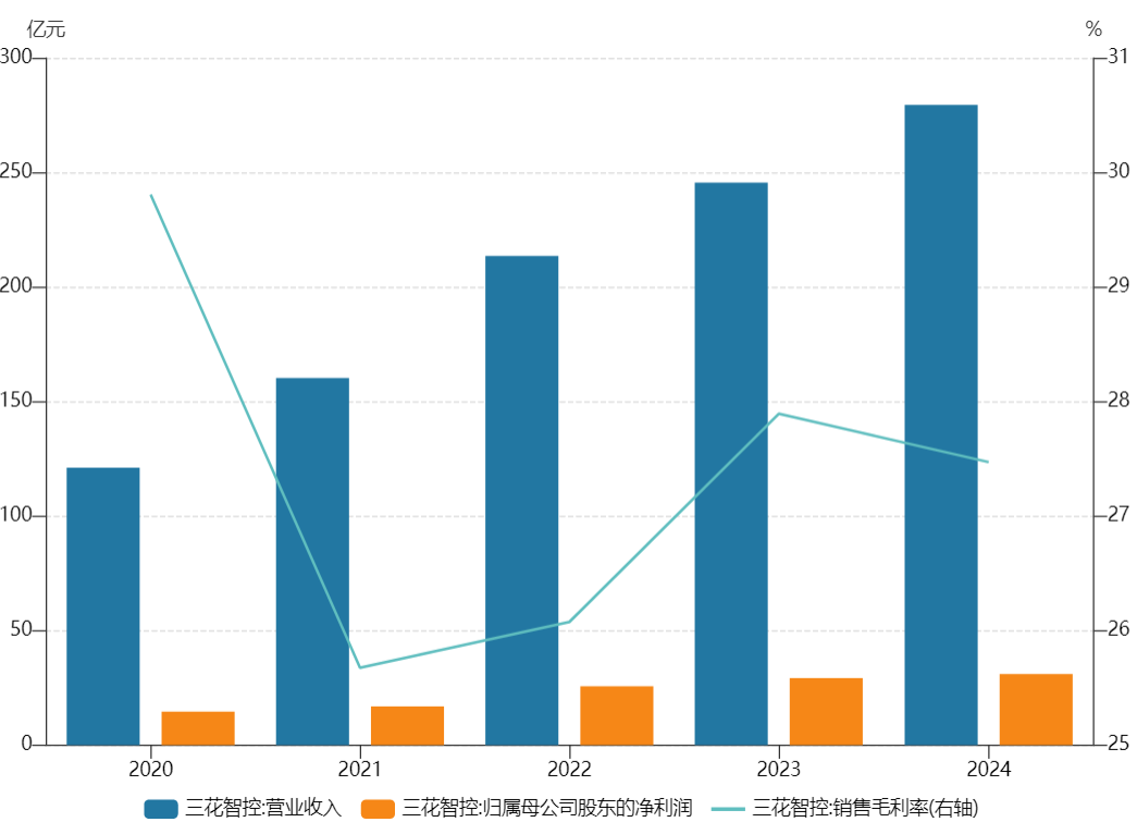 机构多持看好态度。据民生证券电新团队研报认为,三花智控依托电机制造经验和规模优势,成功切入仿生机器人机电执行器制造领域。公司持续优化产品轻量化与高精度性能,仿生机器人有望成为公司第三大核心增长极。中金公司研报认为,三花智控前瞻布局机器人关节总成业务,并配套核心客户储备产能。截至 2024 年底,公司机器人研发团队已超过 180 人,位于行业领先地位。