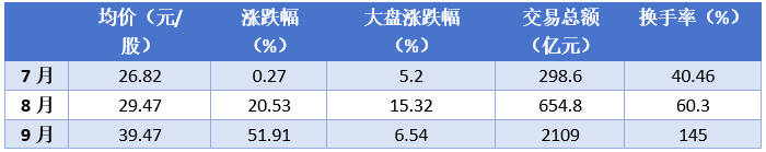 大笔资金则更早就已入局。整个 8 月,三花智控成交金额达到 654.8 亿元,较 7 月增长 64%;换手率为 60.3%。9 月的资金交易更为活跃,成交金额达到 2109 亿元,换手率为 145%。
