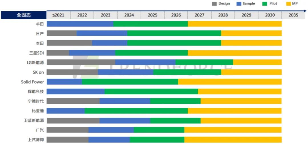 目前,宁德时代、国轩高科、丰田、三星 SDI 等全球领先制造商的全固态电池,都已经进入到试制阶段,并给出了各自的量产时间表。