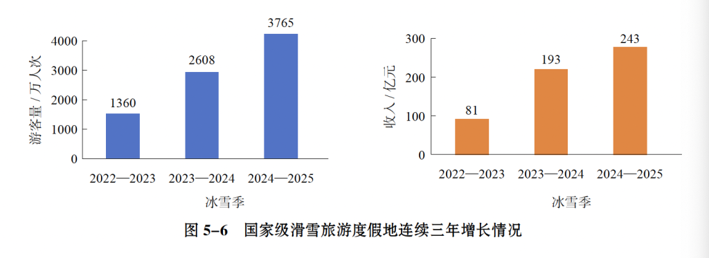《报告》 显示,2024-2025 冰雪季,我国 26 家国家级滑雪旅游度假地接待人次和实现收入连续三个冰雪季实现快速增长。其中,接待滑雪旅游总人次达 2765 万,同比增长 25%,旅游总收入达 243 亿元,同比增长 34%。