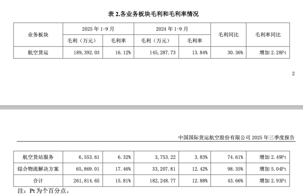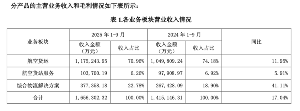 对于净利增长,财报指出,主要由于三季度公司货机机队规模相对 2024 年同期有明显增长,同时,公司航空货运服务、航空货站服务、综合物流解决方案三大业务板块均取得了较好的经营结果。