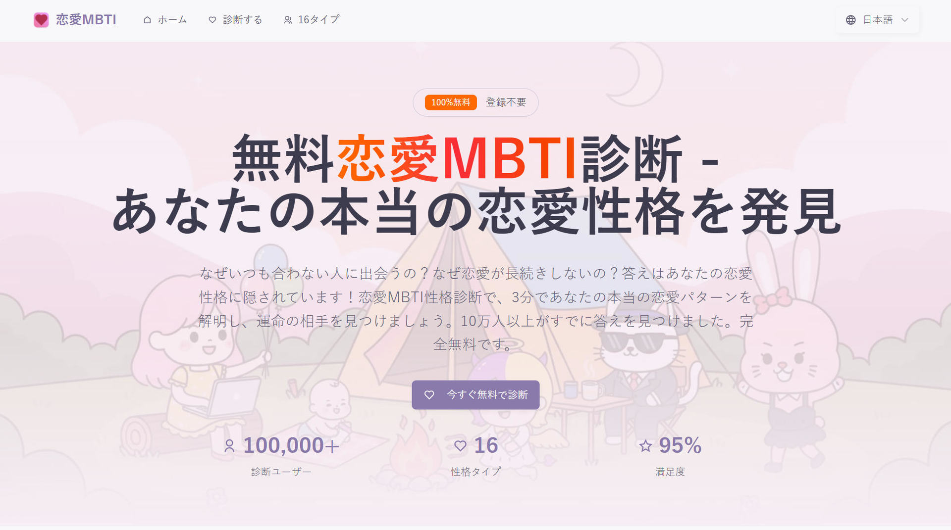 这是一个基于 MBTI 理论的恋爱性格诊断工具,完全免费,不用注册,5 分钟就能测完。和普通 MBTI 不同的是,它专门针对恋爱场景做了优化——测的不是你的工作性格,而是你在感情里真实的样子。