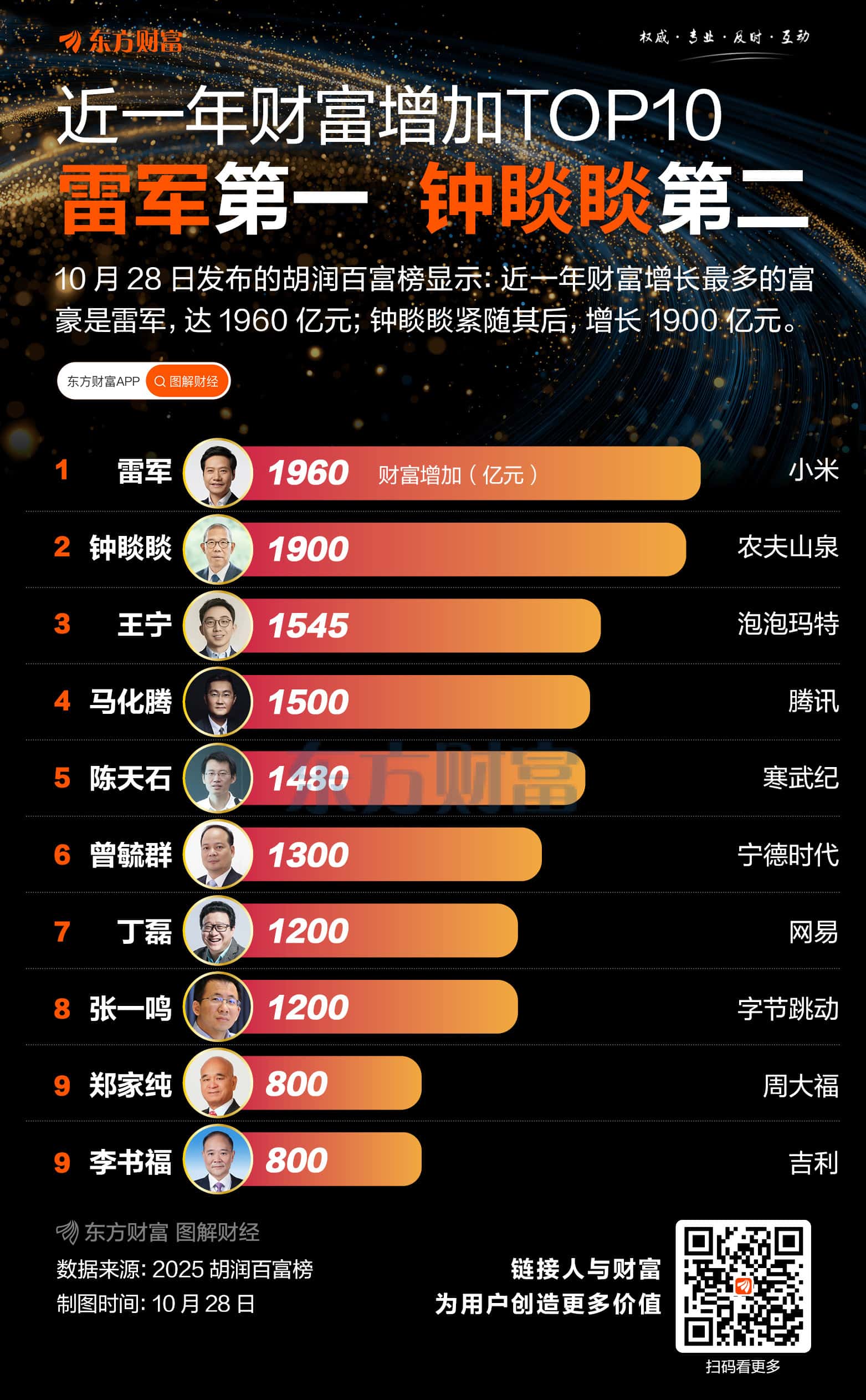 10 月 28 日,胡润研究院发布了 2025 年胡润百富榜。今年是胡润研究院自 1999 年以来连续第 27 次发布 「胡润百富榜」,财富计算截止日期为 2025 年 9 月 1 日。