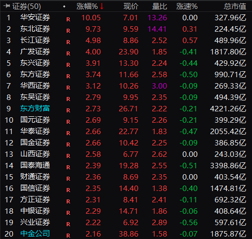 10 月 29 日盘中,A 股券商股集体拉升,华安证券强势涨停,截至午间收盘,东北证券大涨 9.7%,长江证券、广发证券涨超 4%,东方证券、东兴证券、华西证券涨超 3%,东方财富、国元证券、国金证券、华泰证券、山西证券、国泰海通等券商股涨超 2%。