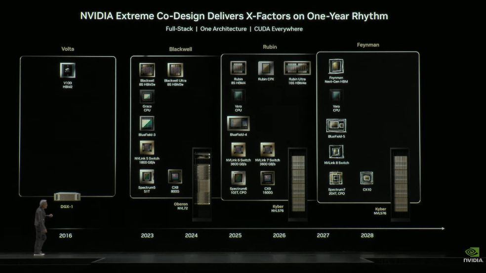 黄仁勋也在现场展示了英伟达截至 2028 年的 GPU 路线图,和下一代 Vera Rubin 架构芯片的样机。这款产品可能要到明年此时或更晚一些才能量产发货。
