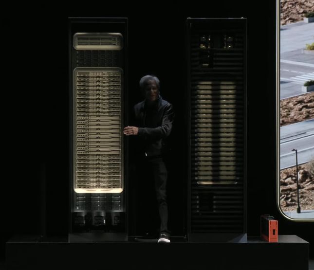 现场也展示了英伟达的液冷 AI 服务器机架。黄仁勋比划称,1 吉瓦数据中心需要 8000 个这样的机架。单个机架重达 2 吨,由 150 万个零部件构成。
