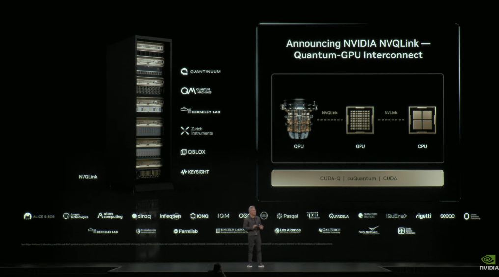 英伟达同时展示了基于 CUDA‑Q 核心构建的 NVQLink,用于连接传统 GPU 和量子计算机,共同加速量子计算。目前的量子计算对环境噪声高度敏感,且可用性有限。因此需要基于 GPU 的超级计算机承担起量子处理器的部分负载,支持量子纠错所需的控制算法。