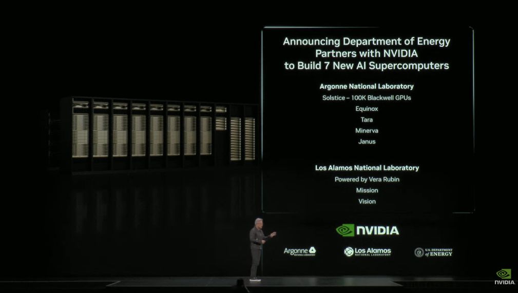 黄仁勋还宣布与美国能源部达成协议,将再建设 7 台超级计算机。这些超算将使用 Blackwell 和下一代 Vera Rubin 架构芯片,分别配置在阿贡国家实验室和洛斯阿拉莫斯国家实验室。