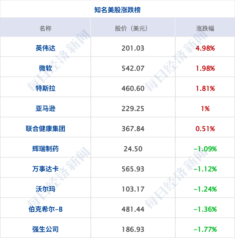 美股三大指数集体收涨,续创新高,纳指涨 0.8%,道指涨 0.34%,标普 500 指数涨 0.23%;英伟达涨约 5%,续创新高,市值一夜增加 2318 亿美元 (约合人民币 16456.18 亿元),总市值逼近 5 万亿美元;微软涨约 2%,总市值重新站上 4 万亿美元;英特尔涨超 5%,特斯拉、亚马逊涨超 1%,苹果、奈飞、Meta 小幅上涨;谷歌小幅下跌;诺基亚 ADR 涨约 23%,创 2021 年 1 月份以来最大单日涨幅。纳斯达克中国金龙指数跌 1.23%,中概股多数下跌,爱回收跌超 6%,名创优品跌近 3%,百度、阿里巴巴跌超 1%;小马智行涨超 11%,哔哩哔哩涨超 5%,京东涨近 1%。