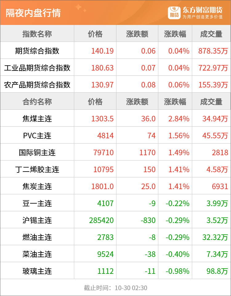 焦炭:10 月 29 日山东地区潍坊、滨州、德州、济宁、枣庄、菏泽、日照、泰安、临沂等市场焦炭价格计划提涨,捣固湿熄焦上调 50 元/吨,捣固干熄焦上调 55 元/吨,顶装湿熄焦上调 70 元/吨,顶装干熄焦上调 75 元/吨,自 10 月 31 日 0 时起执行。(我的钢铁网)
