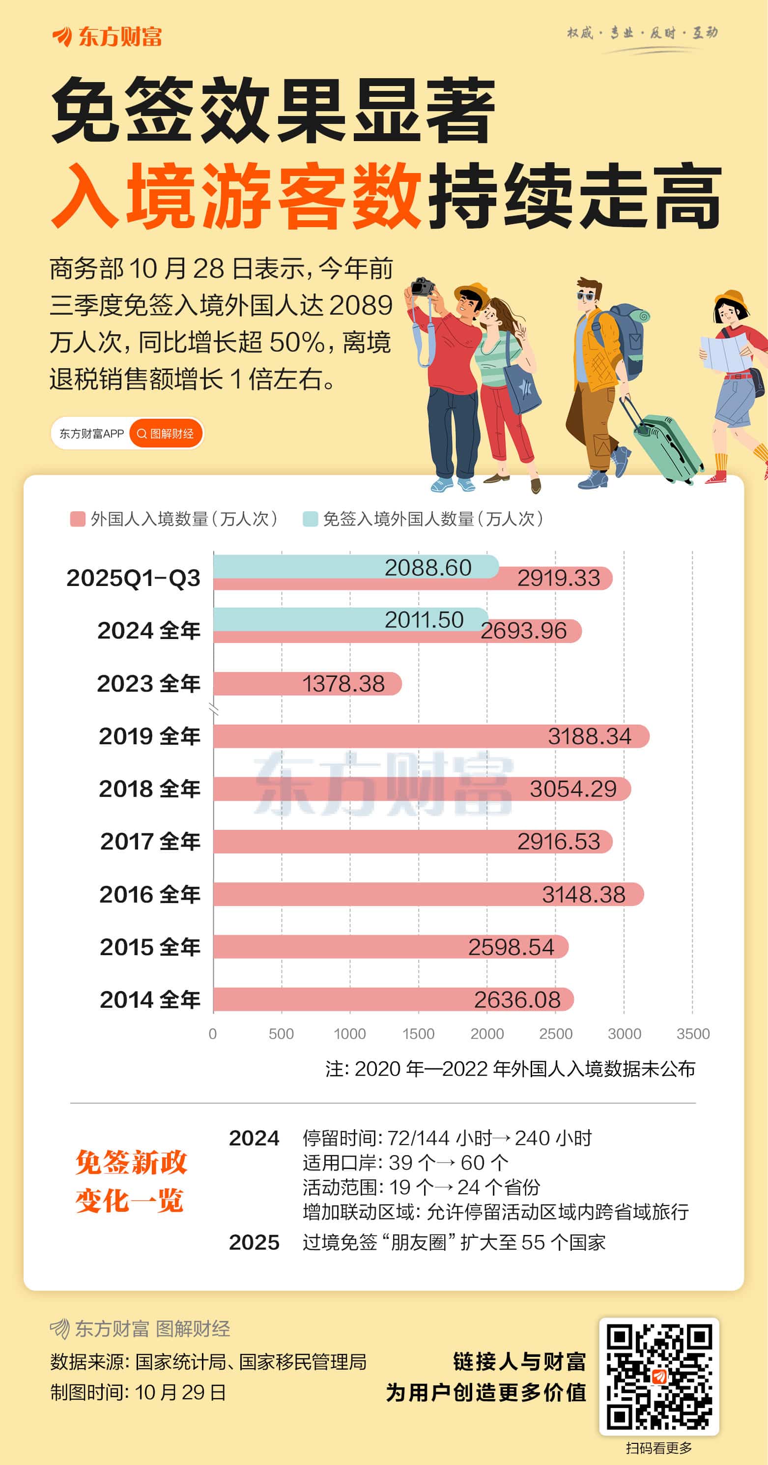 同时,根据国家统计局和国家移民管理局数据,今年前三季度入境外国人为 2919.33 万人次,已超去年全年,其中 71.6% 为免签入境。