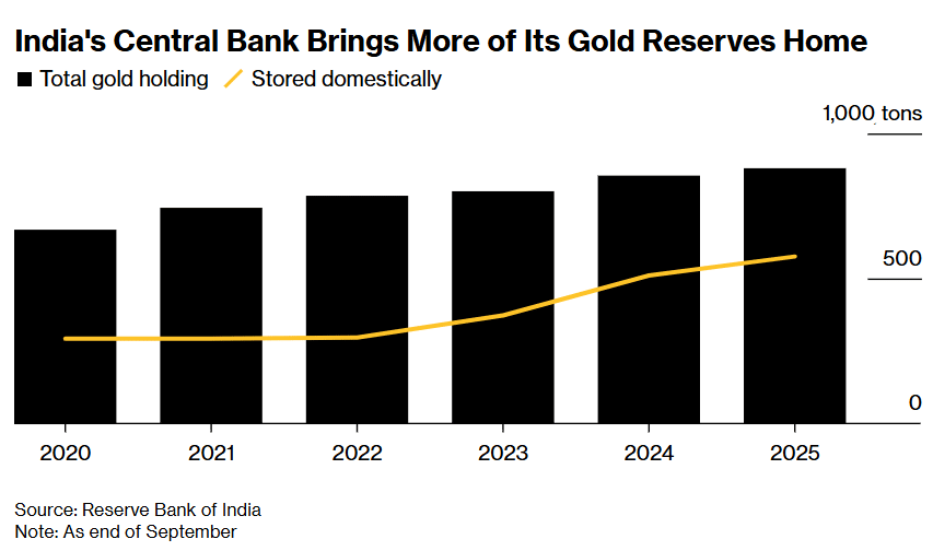 截至 2025 年 9 月底,该行已将超过 65% 的黄金储备存放在国内,这一比例较四年前近乎翻倍,且在 2025 年 4 月开启的财政年度前六个月内,累计从海外运回近 64 吨黄金,凸显出加速黄金回流的明确态势。