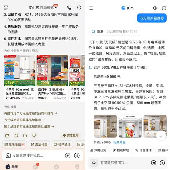 「万元级冰箱推荐」,同样的问题向 Kimi、元宝、通义、文小言、DeepSeek 提问,只有 Kimi 和文小言的回答中出现商品链接,接入的是淘宝和京东,但点击商品链接发现,大多是第三方代理商家店铺,而非官方旗舰店。