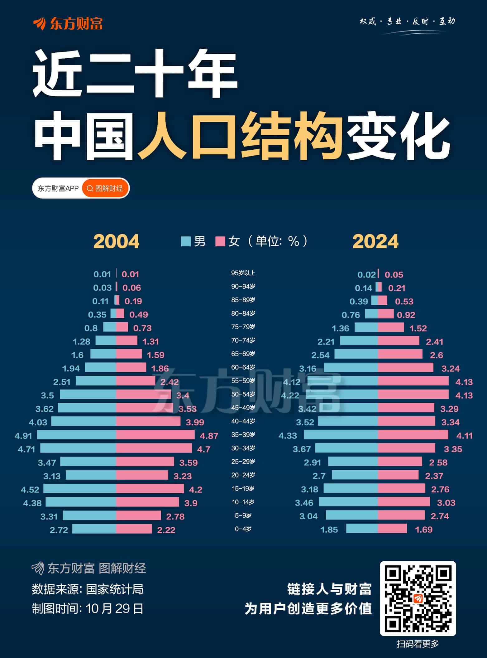 而在 2004 年年末,全国人口 129988 万人,60 岁以上人口约 14300 万人,占全国人口的 10.97%,其中 65 岁及以上人口 9857 万人,占全国人口的 7.6%。二十年的时间里,60 岁以上的人口在全国人口中的占比已然翻倍。