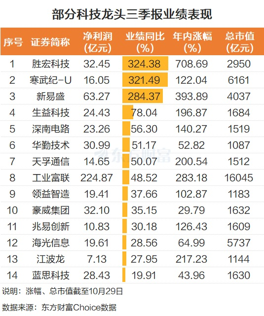 比如 PCB(印制电路板) 龙头胜宏科技,前三季度实现归母净利润 32.45 亿元,同比增长 324.38%。寒武纪前三季度归母净利润 16.05 亿元,同比增长 321.49%。新易盛前三季度净利润 63.27 亿元,同比增长 284.37%。天孚通信、工业富联、海光信息、江波龙等近期热门股,前三季度的业绩也是十分亮眼。