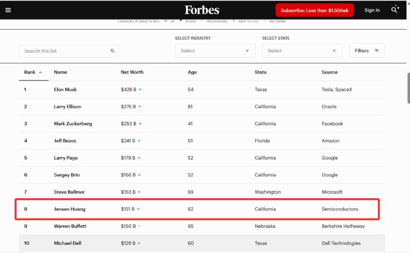 随着英伟达股价的大幅上涨,福布斯实时富豪榜显示,黄仁勋的个人财富上升至福布斯富豪榜第八位。