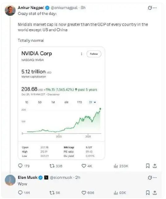 一位网友在社交平台 X 上转发了英伟达市值一度突破 5.1 万亿美元的截图,特斯拉 CEO 埃隆·马斯克也不尽发出赞叹之声。