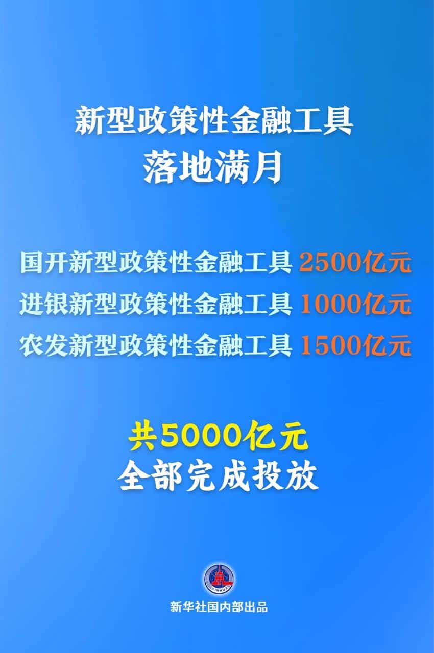 目前,5000 亿元新型政策性金融工具已全部完成投放,有力支持了一批重点领域和薄弱环节项目建设,预计将拉动项目总投资超 7 万亿元。