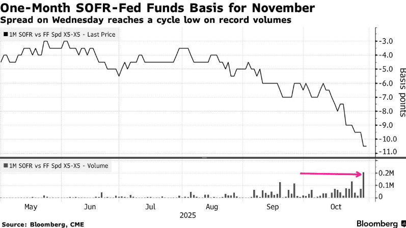 这波交易热潮反映出,在美联储决定停止缩表后若对其管理利率进行调整,两大基准利率间利差变化所引发的市场风险正持续攀升。
