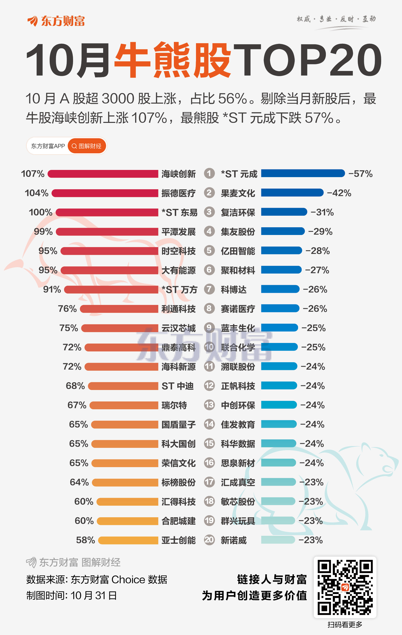 从涨跌分布看,10 月 A 股上涨股票数共计 3057 只,占比超 56%。剔除当月上市的新股后,最牛股是福建本地股海峡创新,当月暴涨 107%;振德医疗、*ST 东易紧随其后,当月分别上涨 104%、100%。此外,平潭发展、时空科技、大有能源等涨幅居前,当月均涨超 90%。