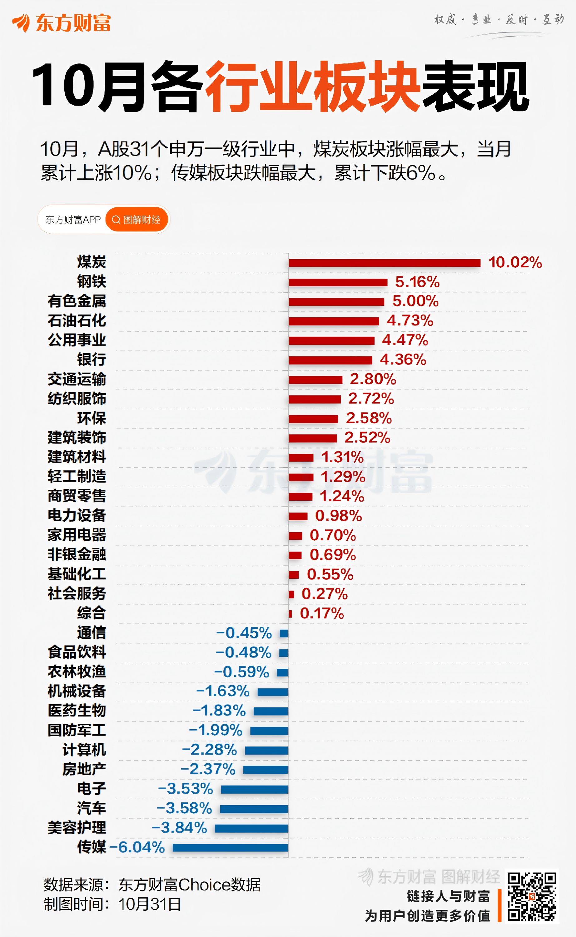 10 月 31 日,A 股当月行情收官,从全月表现看,A 股主要指数表现分化。沪指最新价报 3954.79 点,月内一度站上 4000 点,当月累计上涨 1.85%,月线已 6 连阳。深成指和创指当月均跌超 1%,终结此前月线 5 连阳。
