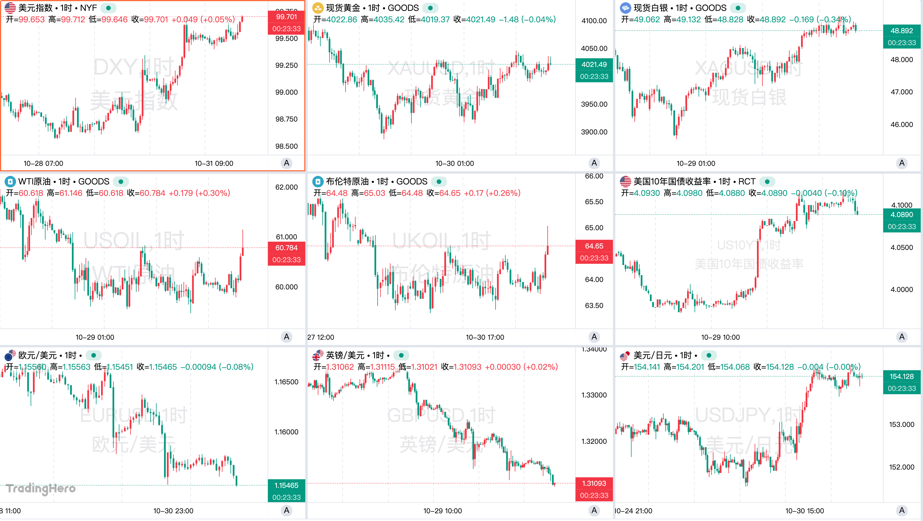 美元指数本周整体呈震荡后走强的态势,周初先因贸易预期改善与市场观望情绪连续震荡,随后在鲍威尔释放 12 月降息并非板上钉钉的鹰派信号后强势拉升,截至发稿报 99.7。