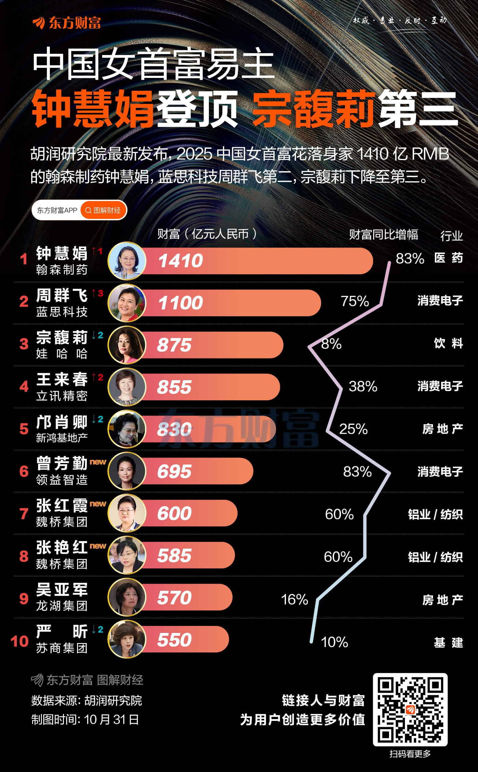 据胡润研究院 10 月 30 日发布的 《2025 胡润女企业家榜》(下简称 「榜单」),中国女富豪 TOP10 已重新洗牌——翰森制药钟慧娟以 1410 亿元人民币财富首次成为中国女首富,蓝思科技周群飞以 1100 亿元居第二,而宗馥莉排名较去年下降两位,以 875 亿元位列第三。领益智造曾芳勤,魏桥集团张红霞、张艳红姐妹则是首次进入榜单前十。