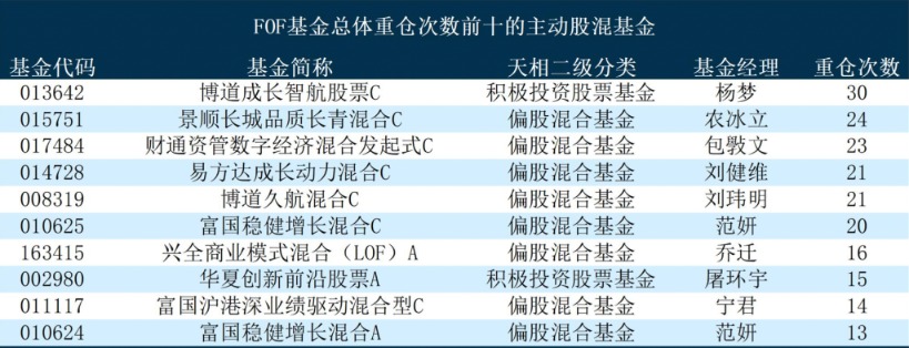 此外,包斅文管理的财通资管数字经济C、刘健维管理的易方达成长动力混合 C、刘玮明管理的博道久航混合 C、知名基金经理范妍管理的富国稳健增长混合 C,均被 FOF 基金重仓超 20 次。