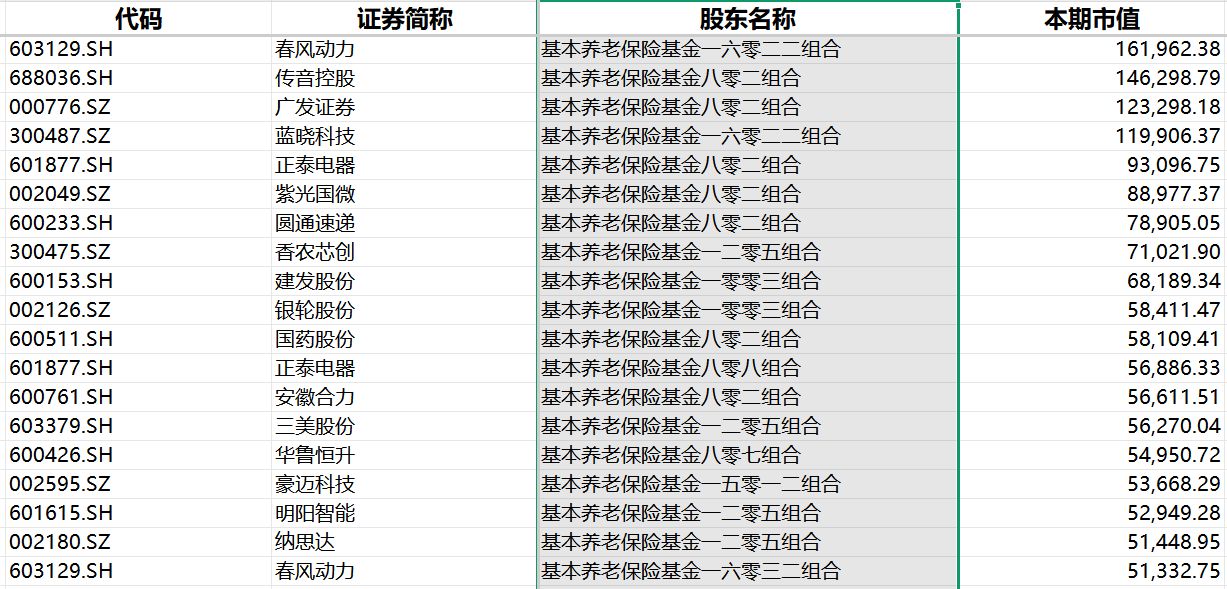 从本期市值维度看,养老基金持股市值最高的个股是春风动力,养老金一六零二二组合、一六零三二组合分别持有 603.77 万股、191.36 万股,持股市值达 16.2 亿元、5.13 亿元;春风动力也是单只养老基金持股市值最高的品种。