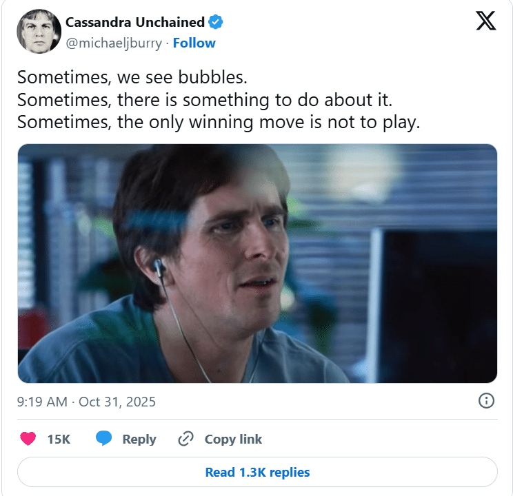 「有时,我们会看到泡沫。有时,我们能做些什么。有时,唯一的获胜策略就是不参与。」 伯里在 X 平台发帖称,还附上了演员克里斯蒂安·贝尔 (Christian Bale) 在 《大空头》 中的剧照——贝尔在片中饰演伯里。