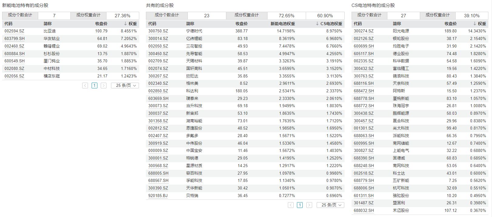 从两个指数的成分股来看,对比后可以发现两个指数重合的成分股共有 23 只,其中国证新能源车电池指数独有的成分股是 7 只,中证电池主题指数独有的成分股是 27 只。