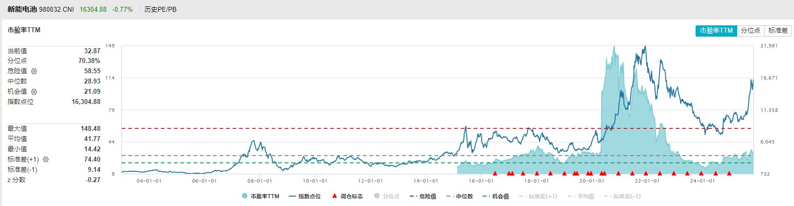 再看两个指数目前的估值水平,Wind 数据显示,国证新能源车电池指数目前的市盈率 TTM 已经回升到历史 70% 分位左右,而中证电池主题指数目前的市盈率 TTM 仍在历史 40% 分位以下。
