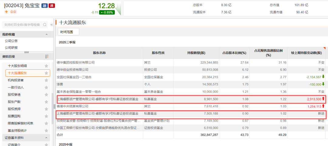 兔宝宝近期发布的三季报显示,截至三季度末,睿郡有孚 1 号私募证券投资基金持有该公司 898 万股,相较于二季度末增持 291.4 万股。同期,睿郡有孚 3 号私募证券投资基金更是新进该公司前十大流通股股东名单。