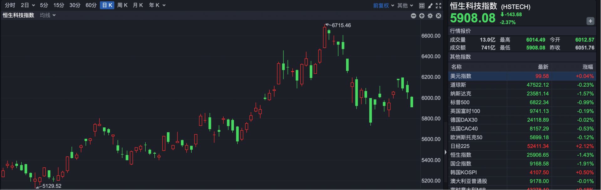 恒生科技指数报收于 5908.08 点,下跌 143.68 点,跌幅 2.37%,10 月累计下跌 8.62%。