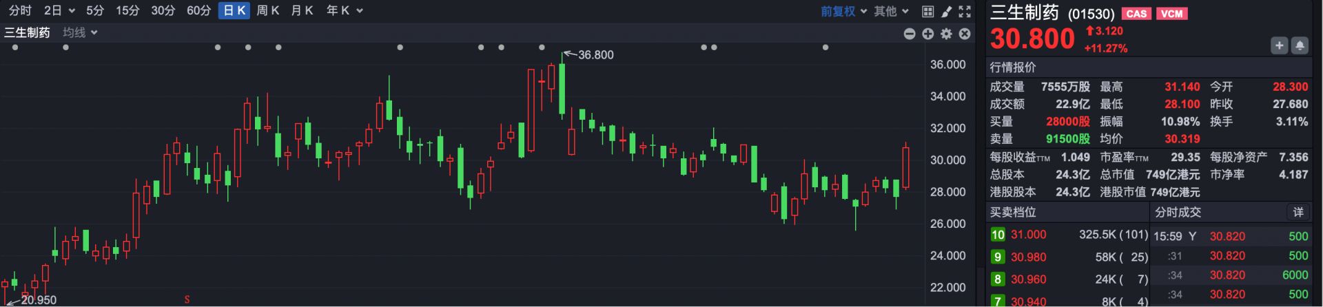 板块方面,主要板块全线回落,半导体、电器设备、煤炭、机械、可选消费、软件服务等板块均表现较差。不过,港股创新药板块逆势走强。其中,三生制药 (01530.HK) 大涨超 11%,映恩生物-B(09696.HK) 涨超 10%,信达生物 (01801.HK) 涨超 7%,复星医药 (02196.HK) 涨超 6%。