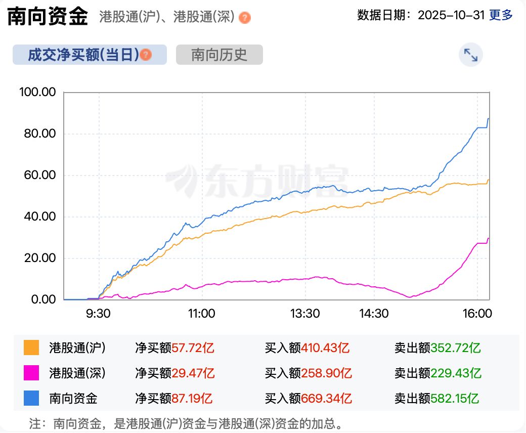 资金方面,截至收盘,南向资金净买入港股金额超 87 亿港元。