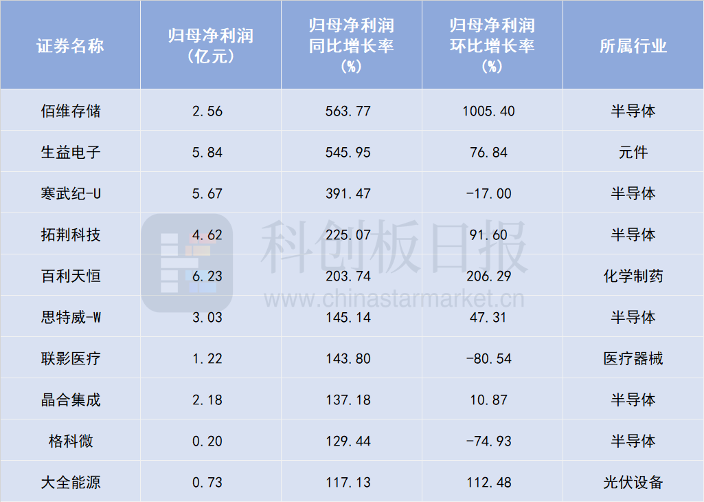 在 Q3 净利润同比增幅前十中,半导体行业公司占据了过半席位,包括佰维存储(存储芯片)、寒武纪 (AI 芯片)、拓荆科技(半导体设备)、思特威 (CIS)、晶合集成(代工)、格科微(CIS);其余则为医药医疗、电子元件、光伏行业公司。