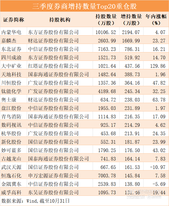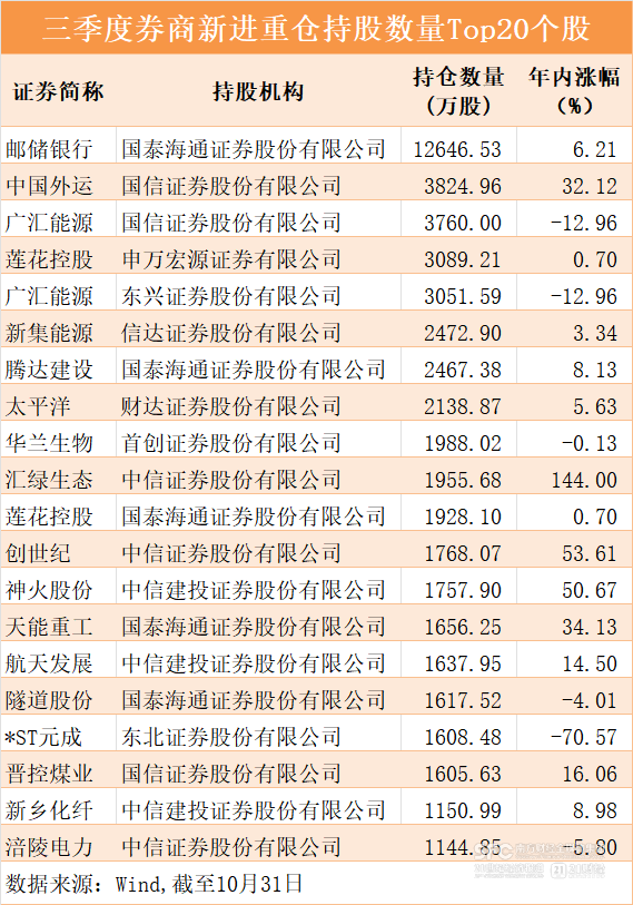 数据显示,截至 10 月 31 日,共有 47 家券商机构出现在 373 家 A 股上市公司前十大流通股股东名单中,合计持股市值约为 667.28 亿元 (以三季度末收盘价计算)。