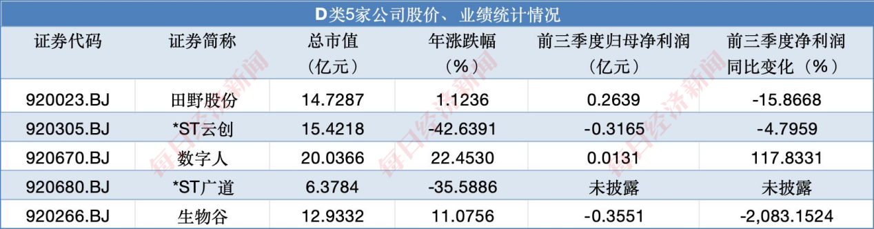 而 D 类的 5 家公司,平均市值为 13.9 亿元;今年以来平均股价涨幅为正的公司有 3 家;前三季度平均归母净利润为-0.1 亿元,2 家公司盈利。其中,生物谷前三季度净利润同比减少超 20 倍,在 262 家公司中垫底。