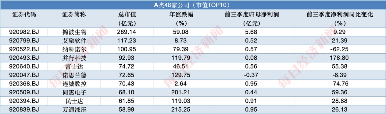 单看 48 家 A 级公司,平均市值为 45.91 亿元,今年以来平均股价涨幅为 84%,前三季度平均归母净利润为 0.49 亿元,前三季度归母净利润平均增速为 28%。